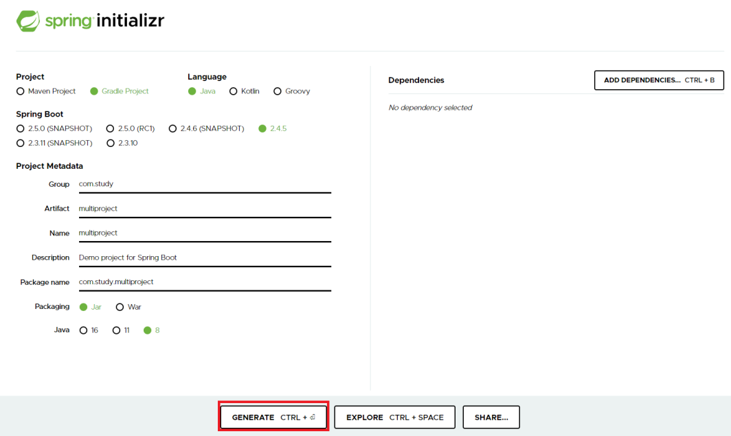 | 1. 아래 spring initializr 홈페이지 접속후 프로젝트 생성 |