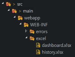 MakeExcel.java 파일에 /WEB-INF/excel로 path가 설정 되어있으므로 해당 경로에 엑셀 파일 서식인 dashboard.xlsx 저장