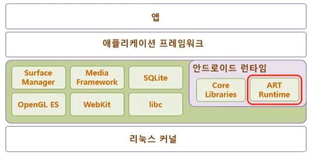 | - 리눅스 커널 위에서 동작 - 빌드 시에는 DEX 포맷으로 만들어지고 실행 시에는 ART 런타임에서 실행됨 - 앱은 애플리케이션 프레임워크 위에서 실행됨 |