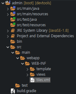 | admin 프로젝트 WEB-INF 폴더 밑에 tiles.xml 생성 |