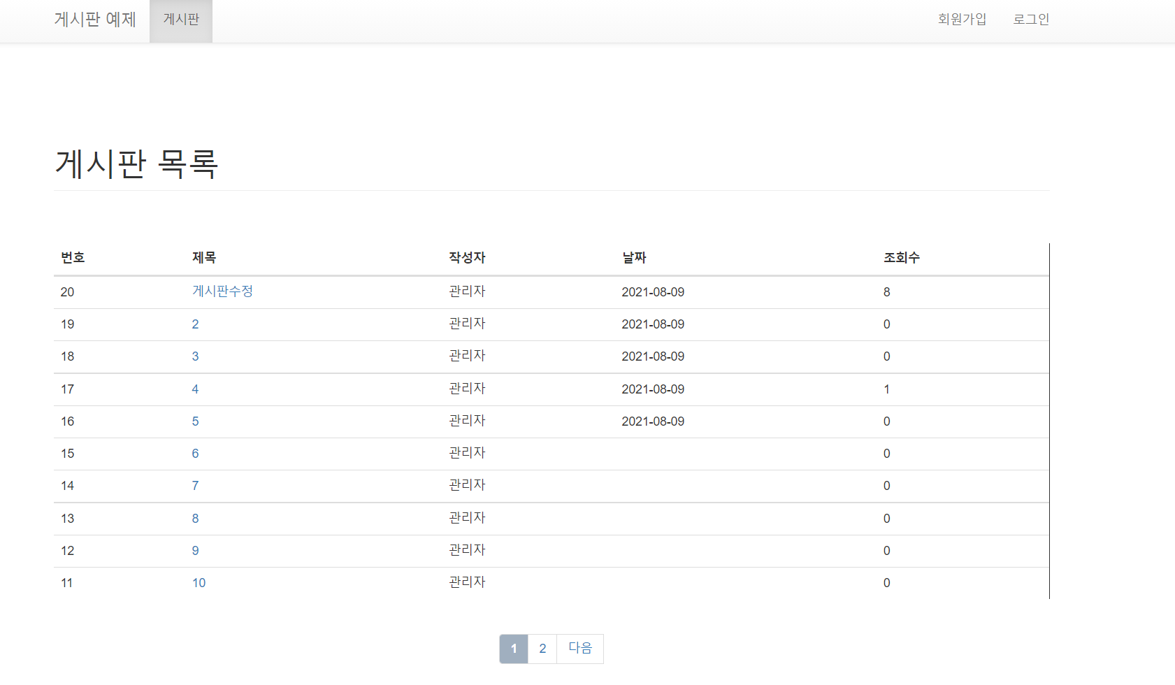 | 게시판 화면 (로그인 안하였을경우) |