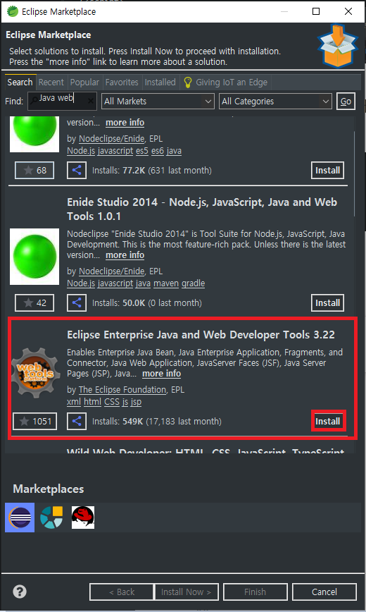 이를 해결하기 위해서 Help-Eclipse MarketPlace에서 Java Web 검색후 install
