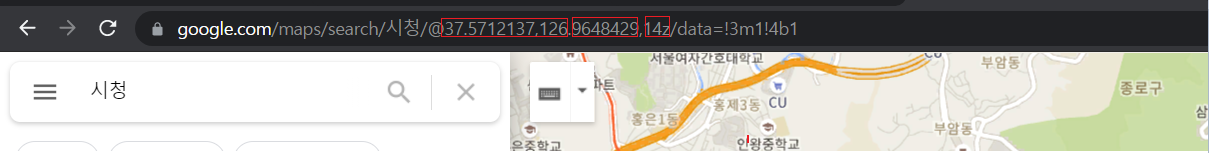 뒤에 @37.5712137,126.9648429,14z/data=!3m1!4b1 해당 파라미터가 붙는것을 볼수있음
