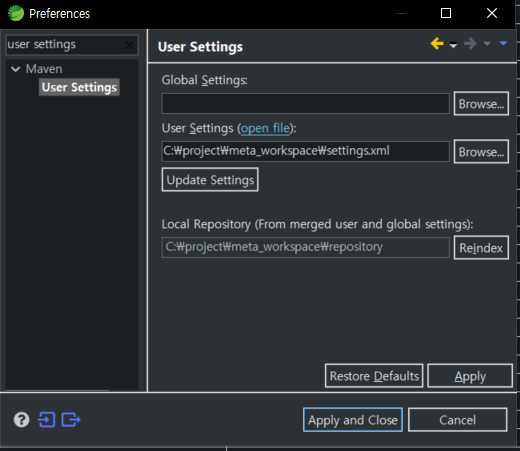 - User Settings input란에 settings.xml 경로 작성후 Update Settings 버튼 클릭