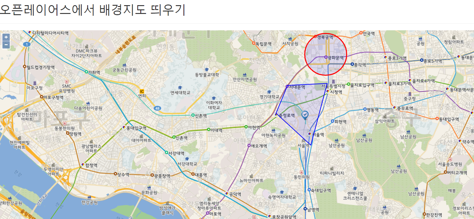 openlayersAddCircle(126.976423, 37.572148, '시위를 많이하는곳');