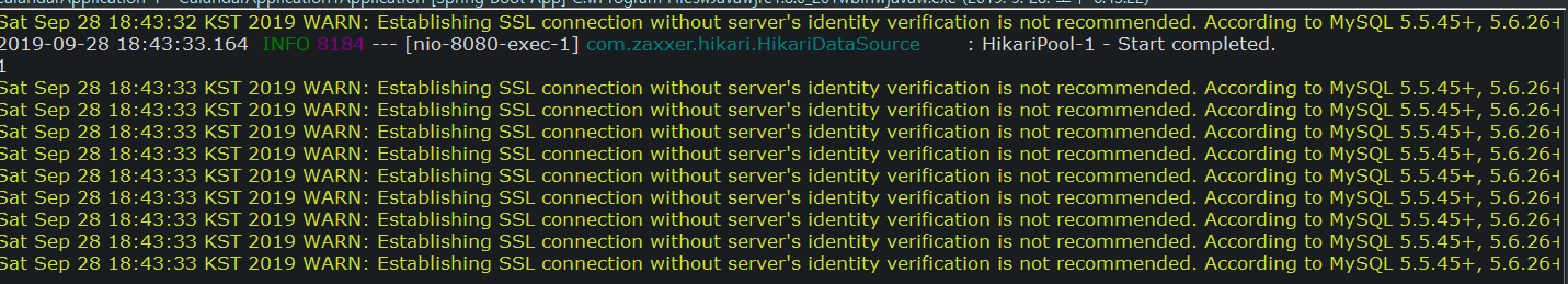 application.properties에 ?useSSL-false를 붙이면 깔끔하게 나옵니다.