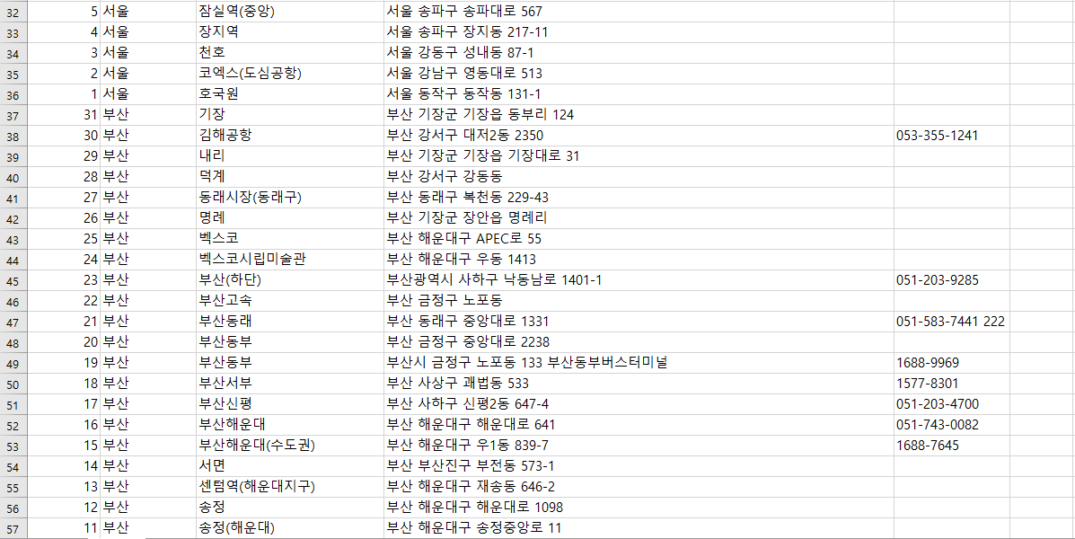 서울 ~ 제주도의 데이터가 엑셀에 들어온것을 확인을 할수 있습니다.