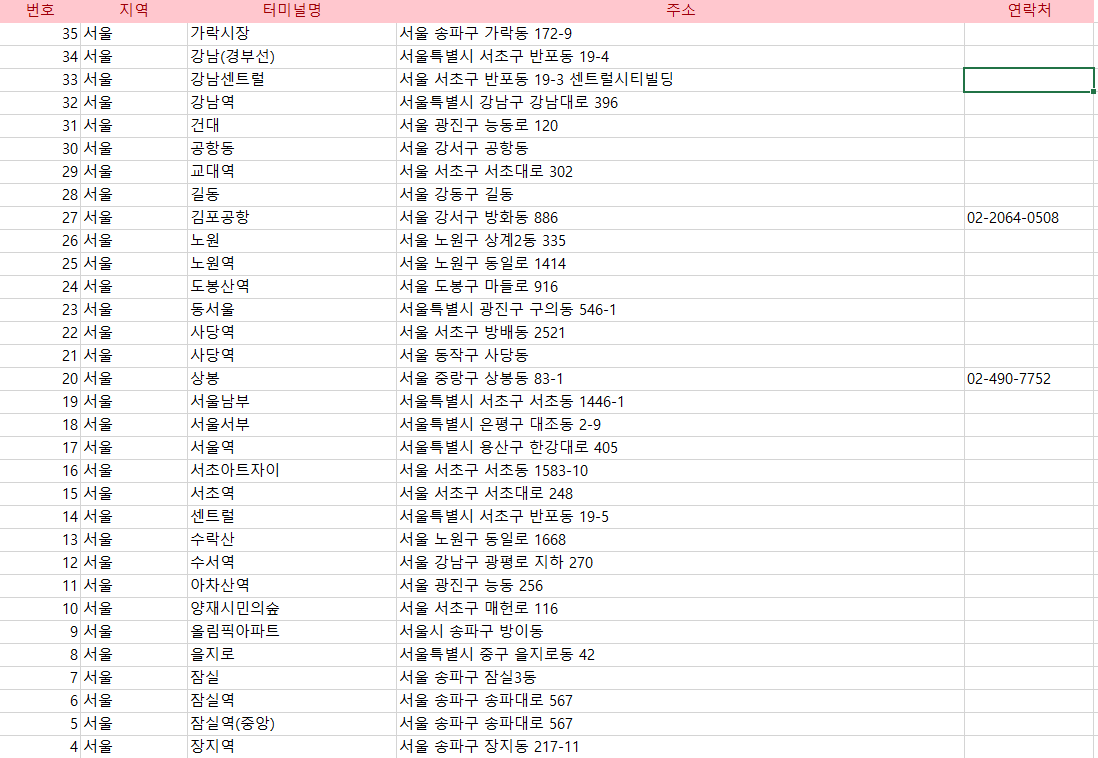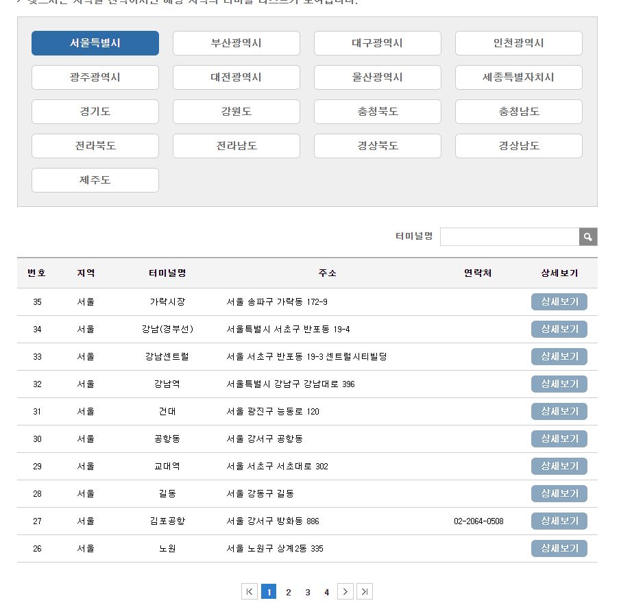 해당 터미널 정보 안내 사이트에서 서울특별시 ~ 제주도 지역의 리스트를 크롤링해서 엑셀로 뽑는것을 해보겠습니다.