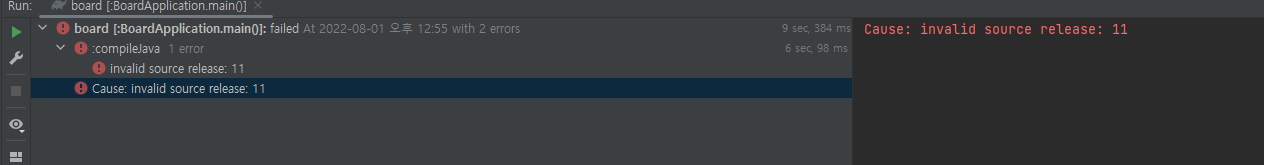 서버 시작시 해당 오류가 나는 경우 컴퓨터에 jdk11이 설정이 안되있는경우입니다.