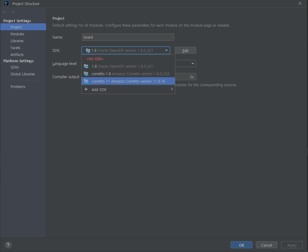 corretto-11을 선택후 apply ok를 클릭합니다.