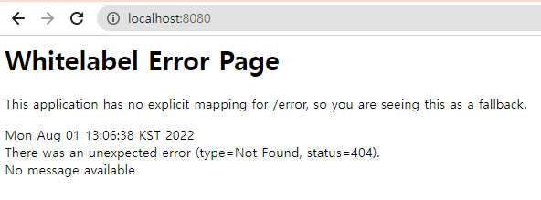 localhost:8080을 주소창에 입력했을때 Whitelabel 에러가 발생하면 성공입니다!