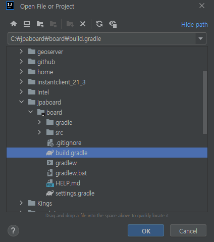 - intelij에서 받은 프로젝트 폴더안에 build.gradle을 open 합니다.
