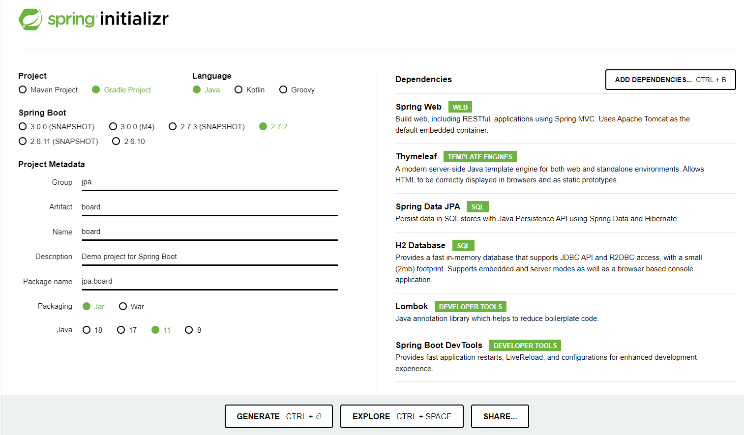 - Group은 jpa, Artifact는 board, Name은 board, packaging은 Jar, Java 버전은 11로 설정하였습니다.