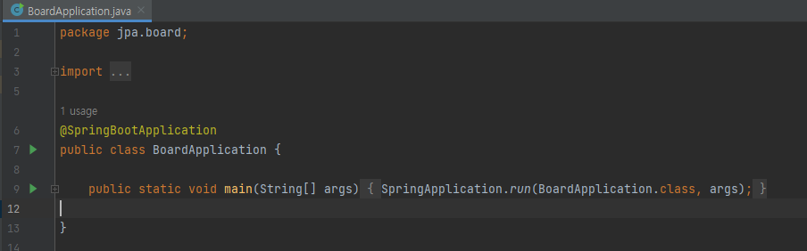BoardApplication.class 파일을 열어 왼쪽에 초록색 재생 버튼을 클릭합니다.