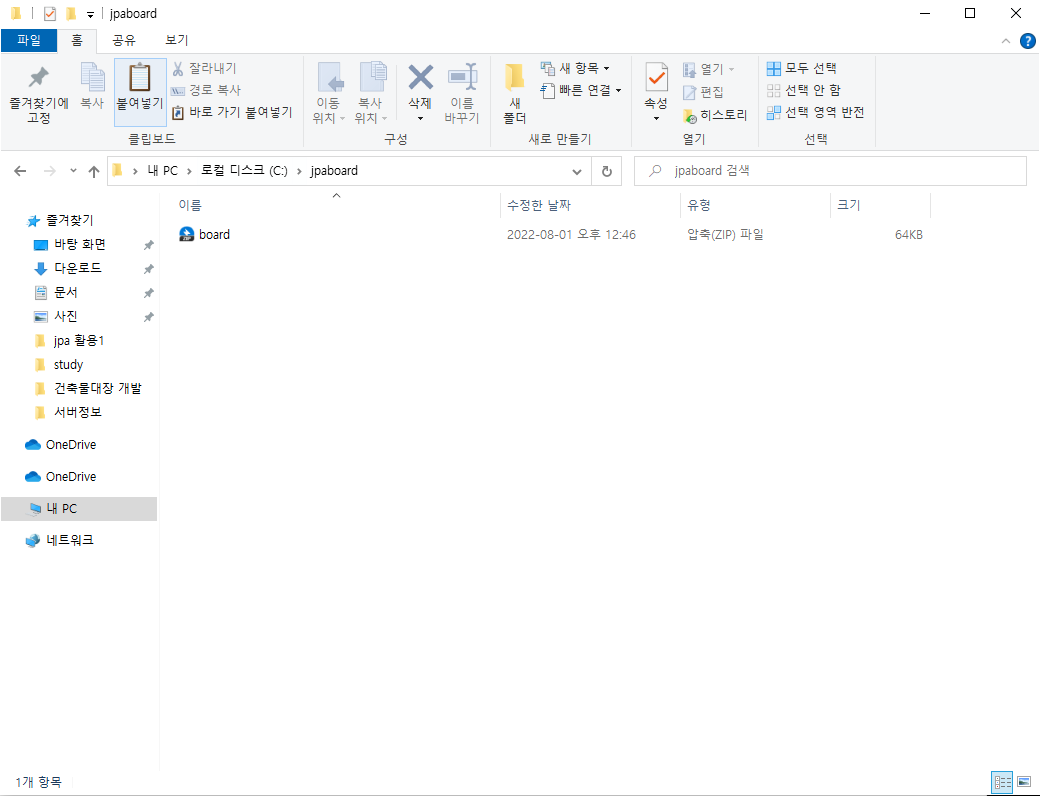 저는 spring start io 에서 만든 프로젝트를 c:\jpaboard에 저장하였습니다.