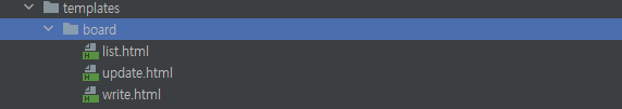- templates 밑에 board 디렉터리를 만들고 list.html, update.html, write.html을 생성합니다.
