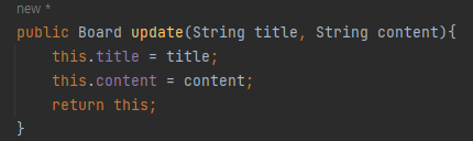 - 엔티티에서 setter를 쓰지않고 생성자를 통해 파라미터를 설정을 하는게 좋습니다. 프로젝트가 커짐에 따라 api도 많이 생겨날텐데 setter를 무분별하게 사용하면 데이터를 set하는 부분이 여러곳으로 퍼져서 객체의 일관성을 보장할수 없습니다. 프로젝트에 오류가 발생하였을때, 어디서 에러가 나는지 찾기가 어려워 유지보수가 어려워집니다.