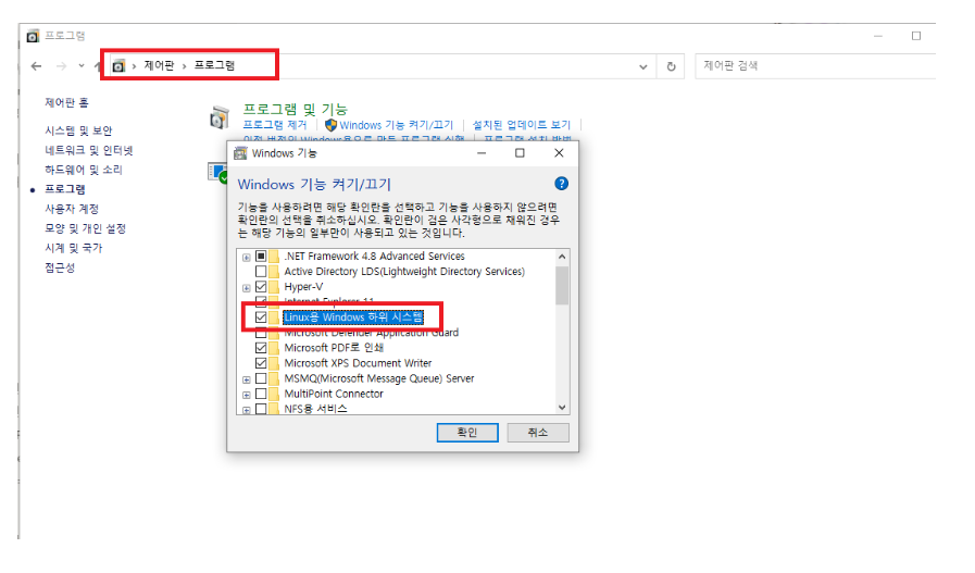 2. 제어판 - 프로그램 - Windows 기능 켜기/끄기에서 Linux용 Windows 하위 시스템을 체크합니다.