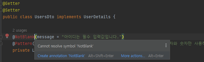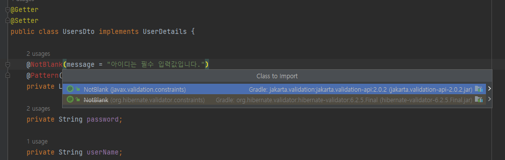 - 회원가입 api를 개발할때 dto에서 유효성검사 관련 어노테이션을 사용하려고 하는데 해당에러를 마주칠경우 Gradle에서 start-validation을 추가하면 됩니다.