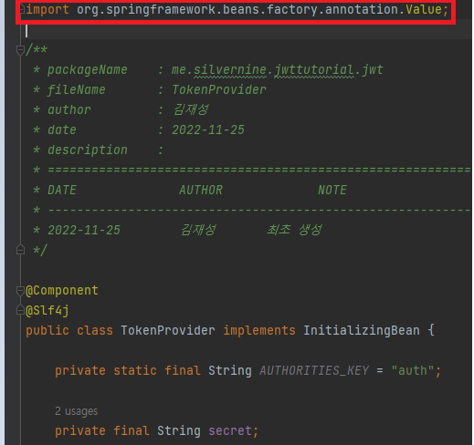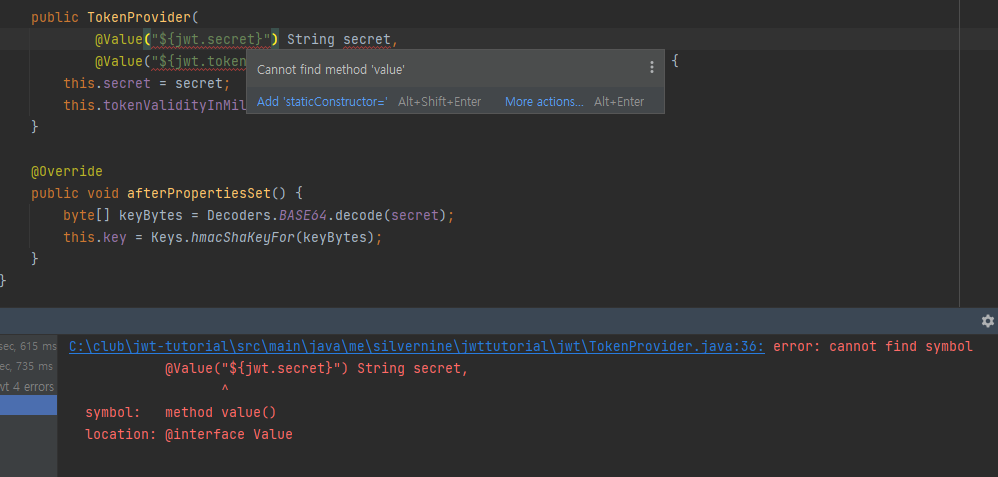 jwt TokenProvider 구현중 Cannot find method 'value' 에러를 마주쳤습니다. 이 에러를 처리하는 방법에 대해 정리하려고 합니다.