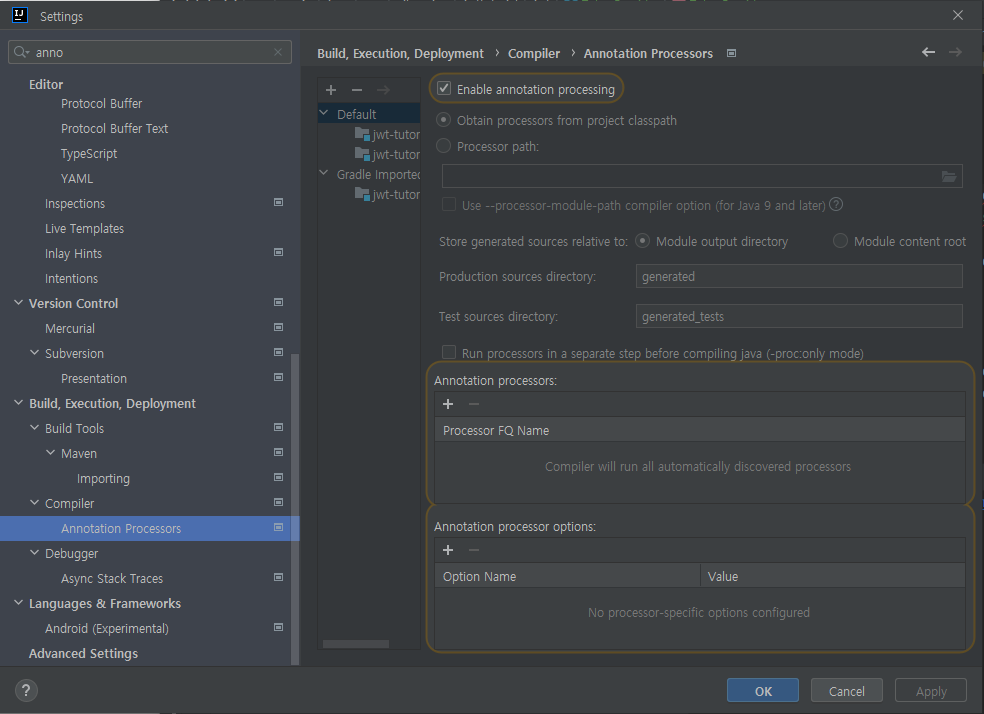 1. File-Settings에서 Annotation Processors에서 Enable annotation processing을 체크합니다.