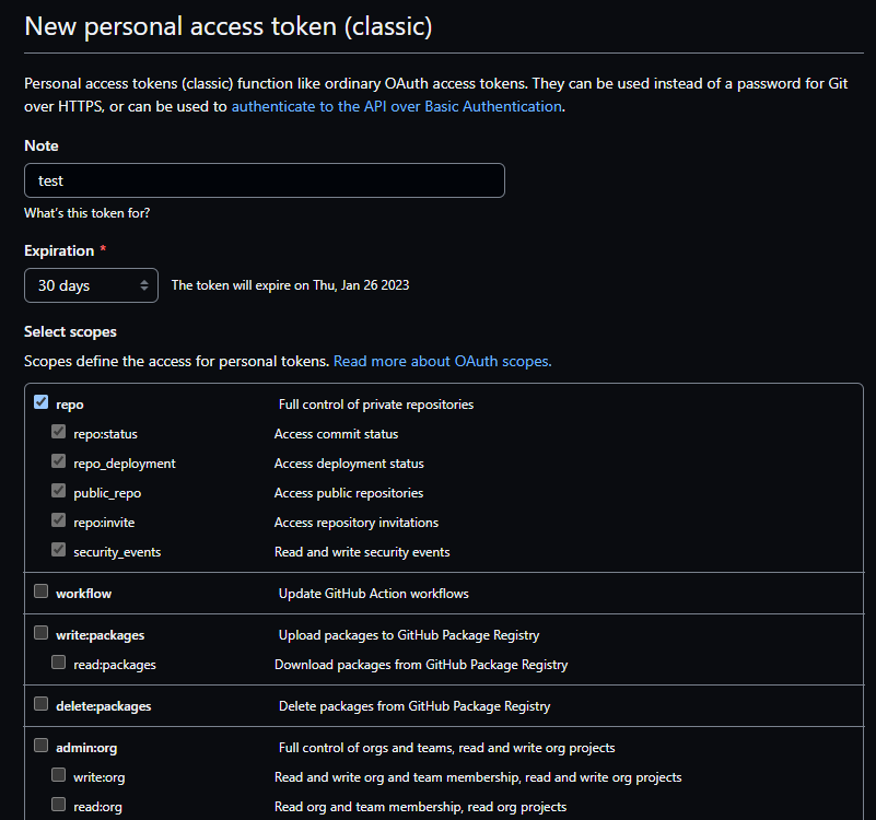 - 토큰명과 repo 체크후 Generate Token 클릭