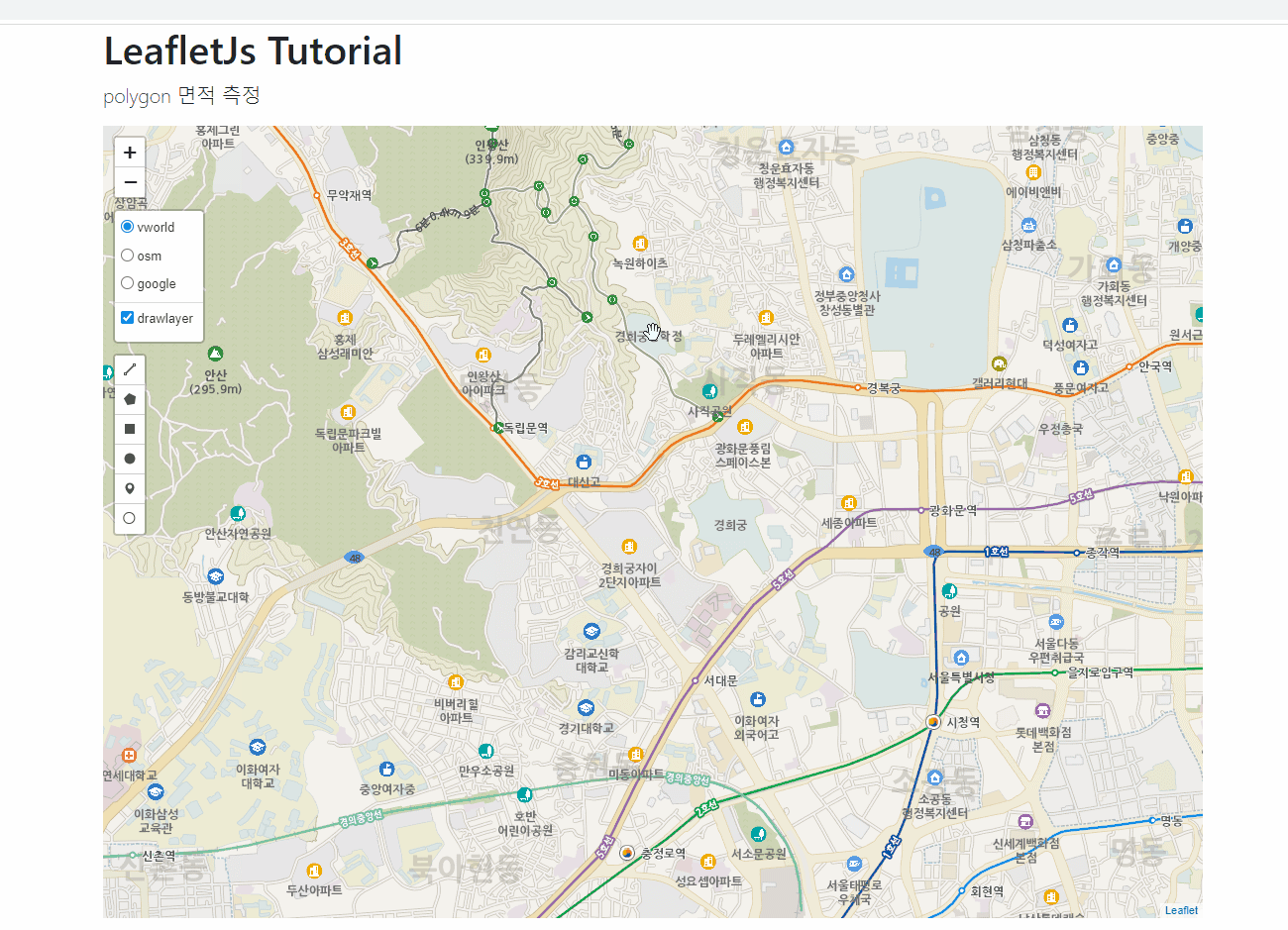 이번장에서는 Leaflet Draw 기능중에 polygon으로 그렸을때 해당 총 면적을 tooltip으로 표현하는것을 해보겠습니다.