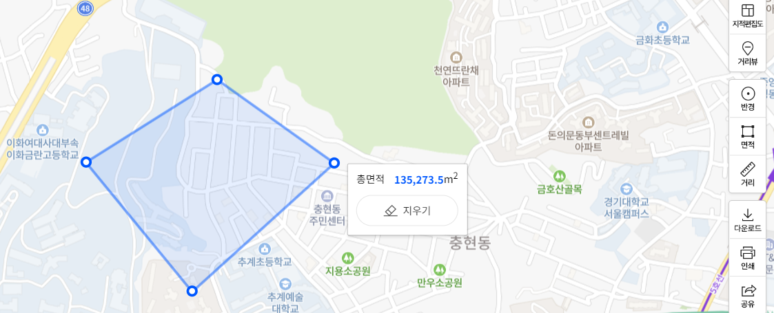 - 네이버 지도에서 면적기능을 클릭하면 polygon을 그리면 총면적을 볼수 있습니다. 해당 기능을 구현해보겠습니다.