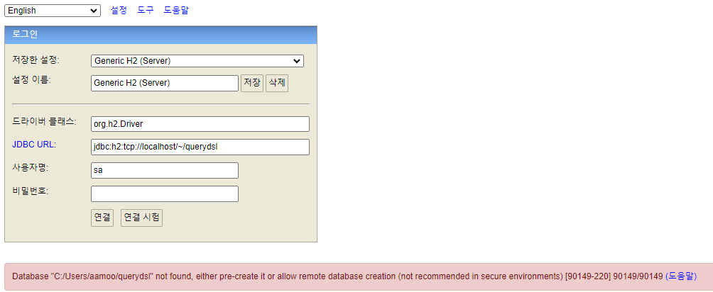 처음에 프로젝트 생성후 Generice H2로 (Server)로 접근하려고 하면 해당 에러가 나오면서 접속이 되지 않음,
