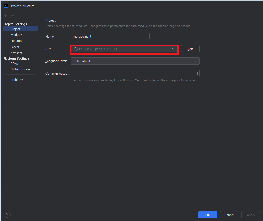 2. File - Project structure 클릭후 SDK가 선택한 JAVA로 선택되어있는지 확인후 변경합니다.