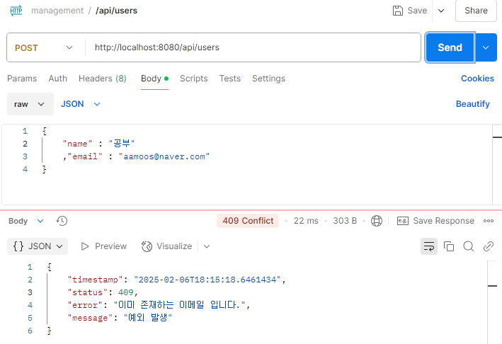 | 409 Conflict | 리소스 충돌 (중복 데이터) | 데이터베이스의 고유 값 제약 조건을 위반할 때 |