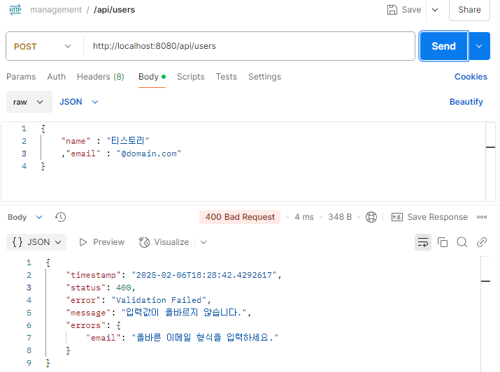 -> handlerValdationExceptions를 추가함, vadliation에 걸렸을때 errorResponse에 400 BAD_REQUEST, 에러 내용을 return 하게 설정함