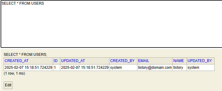 USERS 테이블을 조회하면 날짜와 하드 코딩한 system이 등록자, 수정자에 insert가 된것을 확인할수 있음