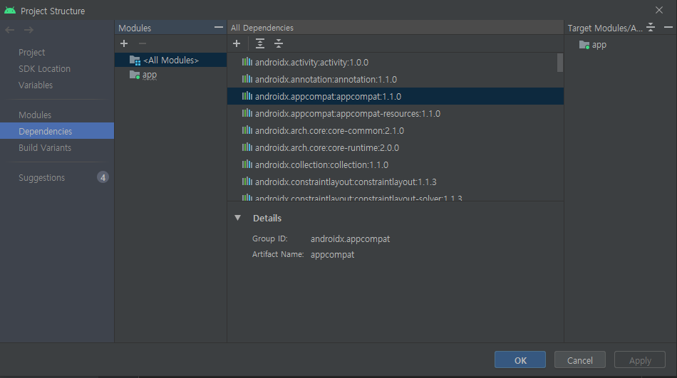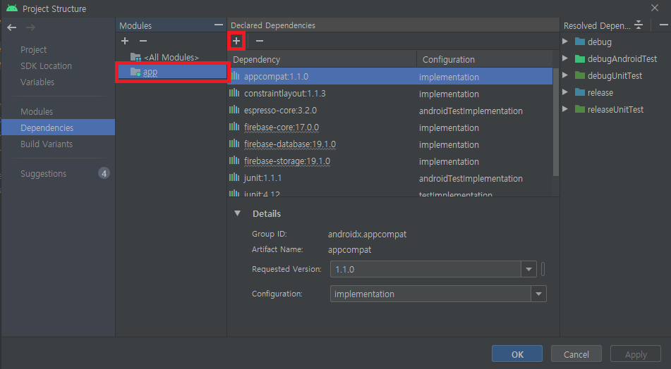 app 클릭 - 플러스 버튼 클릭 - Library Dependencey